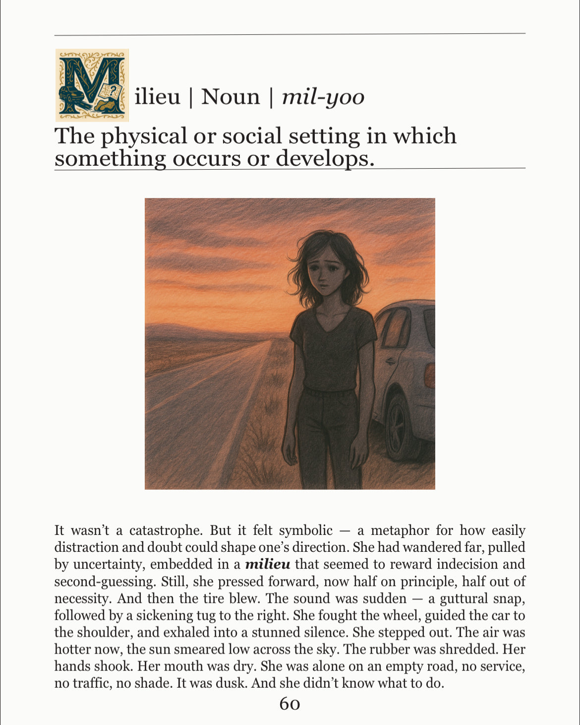 A thought-provoking and adventurous short story that blends the thrill of a solo road trip with the beauty of rich, sophisticated language. Follow the journey of a recent college graduate who, instead of stepping into the career path her father has carefully planned for her, sets off on a cross-country road trip to discover her own identity. Along the way, she encounters quirky towns, eccentric characters, and moments of self-reflection, all while being immersed in a vocabulary as expansive and diverse as the country she’s traversing.